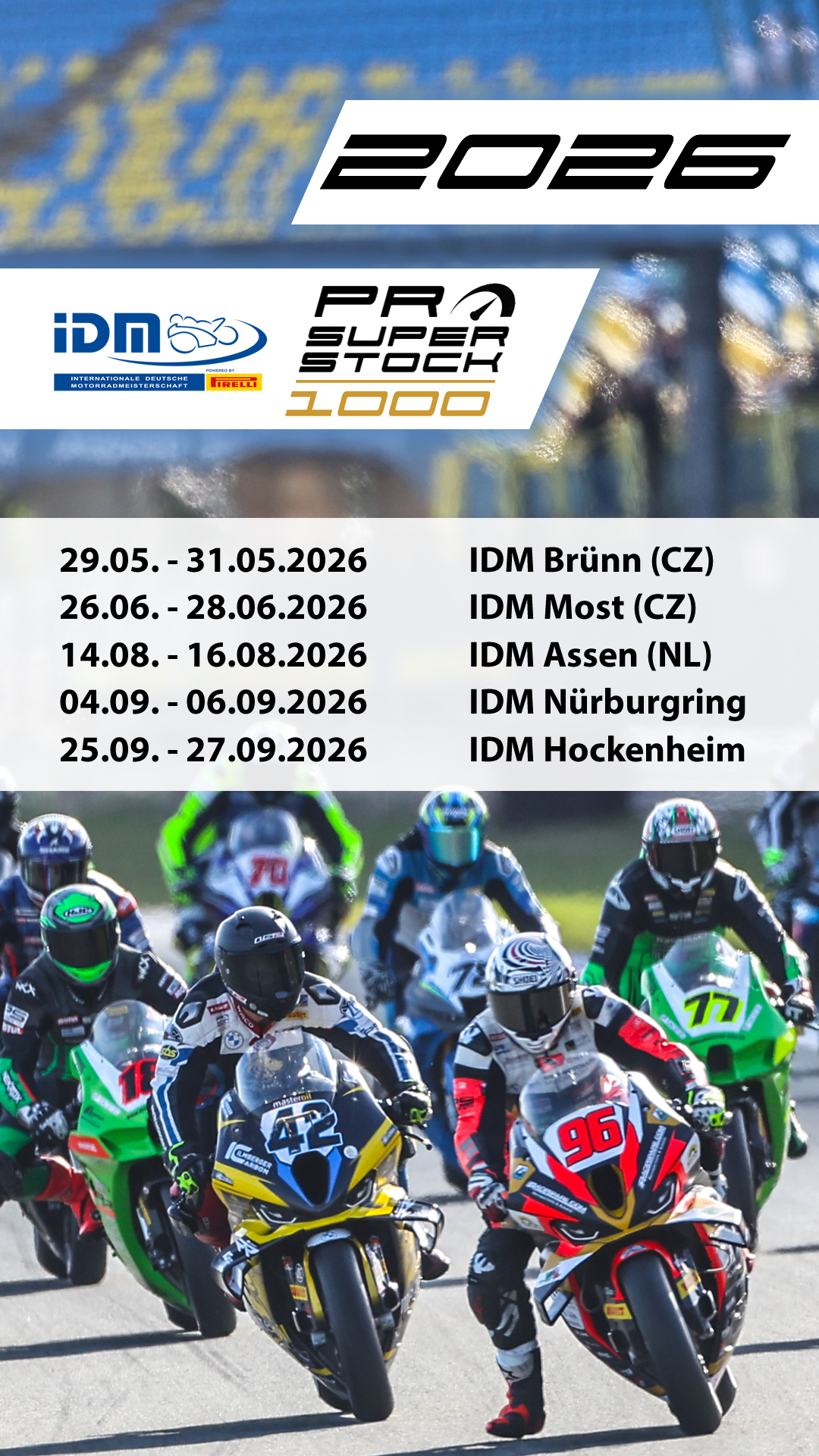 Den Auftakt in der Saison 2026 bildet für den Pro Superstock 1000 und Twin Cup der MotoGP-Kurs im tschechischen Brünn. Die Strecke ist neu im Kalender. Der flüssig zu fahrende Kurs liegt landschaftlich reizvoll am Rande eines Waldgebietes, hat einen spürbaren Höhenunterschied und wird im Uhrzeigersinn gefahren. Die nächste Station ist ebenso im Nachbarland beheimatet und seit mehreren Jahren im IDM-Kalender fixiert: das Autodrom Most. Hier finden jährlich auch Läufe zur Superbike-Weltmeisterschaft statt.